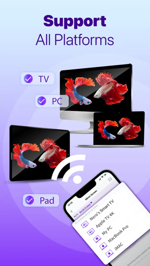 1001 TVs screen mirroring app is a superpower tool to connect any wireless device by sharing the same screen. It's a convenient and practical screen-casting application, it supports mirroring screen to TV, casting screen to computer, and mirror to the web browser. Enjoy the online courses, office meetings, live TV, mobile games, album videos, or other apps on your smart TV screen instead of the small phone screen.