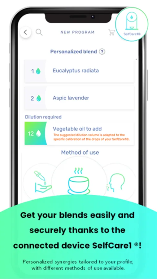 Stay in shape every day and take care of your well-being in an ecological and efficient way with just 8 essential oils! SelfCare1® offers you more than 50 well-being solutions optimizing the use of essential oils, for the whole family! Connect your app via bluetooth to easily program your feel-good SelfCare1® device and obtain your blends immediately, without dangerous handling, with the appropriate advice for use (topical use, steam inhalation, olfaction or other).