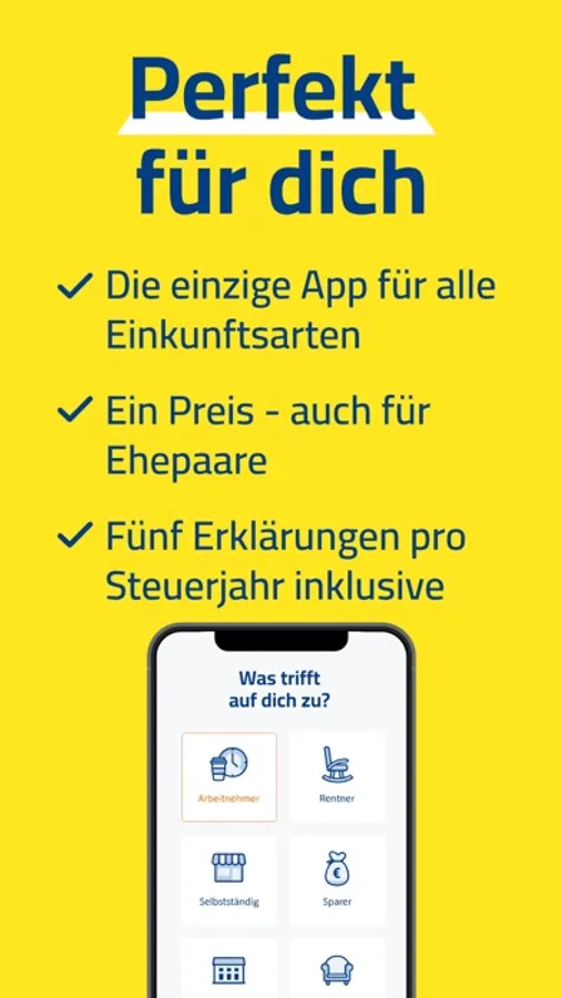 WISO Steuer: Die Steuer-App für alle Fälle. Denn nur mit WISO Steuer kannst du alle deine Einkünfte auch am Smartphone eintragen. Egal, ob du die Steuererklärung als Student, Arbeitnehmer, Sparer, Rentner, Vermieter oder Selbständiger machst. Deutschlands beliebteste Steuersoftware ist für jede Steuererklärung die beste Wahl. 2019, 2020, 2021 oder 2022 – alles ist möglich mit WISO Steuer.