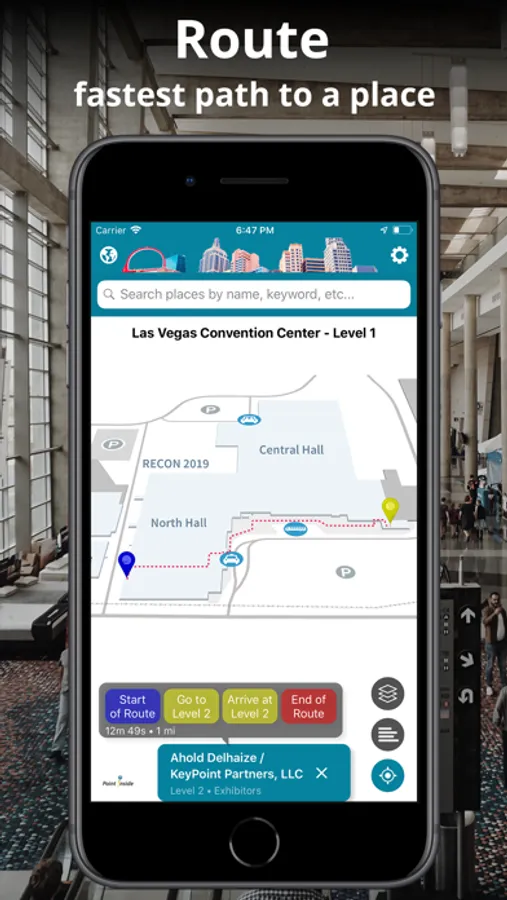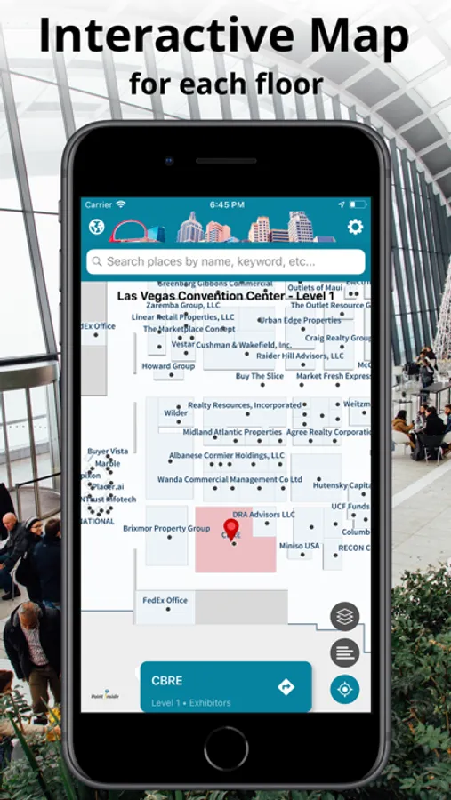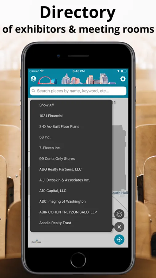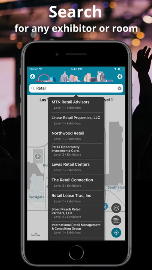 For trade show venues, search for exhibitors to locate their booths on the maps, as well as find meeting rooms and other services.