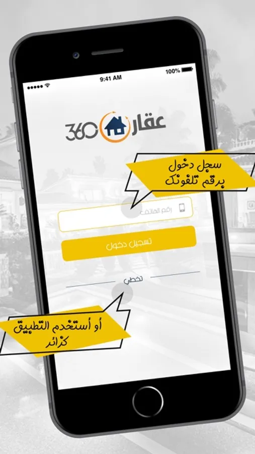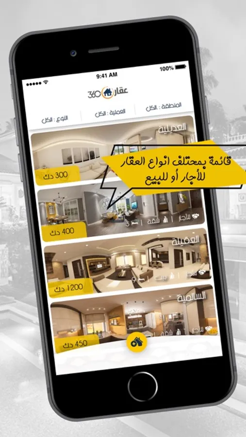 تطبيق عقار٣٦٠ يوفر عليك عناء البحث عن العقار من خلال مشاهدة العقار من الداخل والتنقل بين الغرف بتقنية البانوراما ، التطبيق يوفر لك مختلف انواع العقار سواء كانت شقق أو بيوت أو غيرها