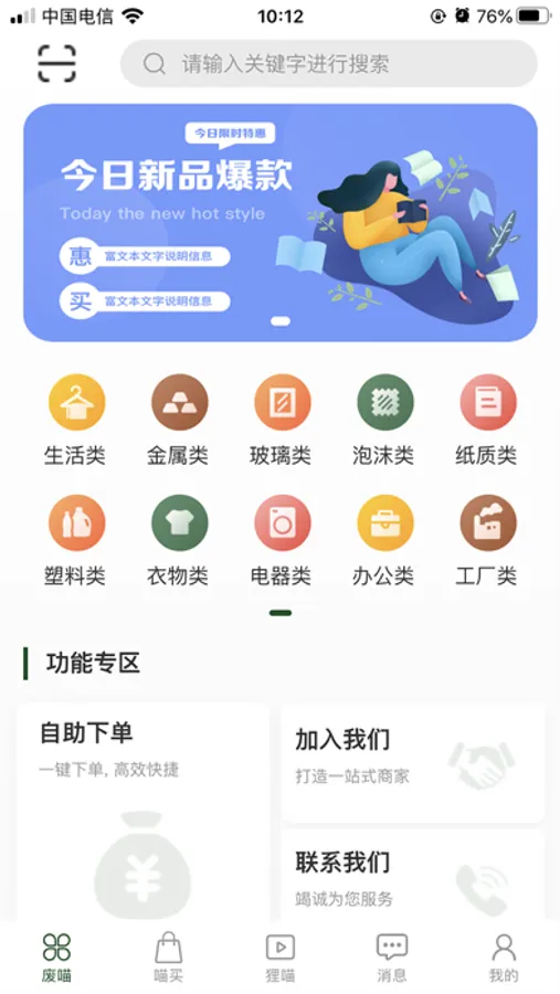 废喵坚持“经济要发展,环境要保护”的方针,本着“让地球更干净,让生活更美好”的愿景,长期从事垃圾分类,上门回收等便民服务,主要服务于家庭、机关、学校、医院、写字楼、工厂等场所。