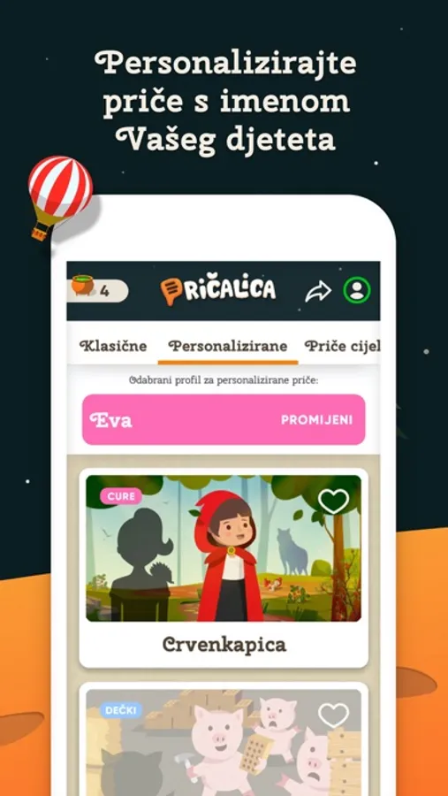 U Pričalici kreirajte personalizirane priče - priče u kojima Vaša djeca i Vi postajete glavni junaci. Odaberite ime djeteta, boju kose, najdražu hranu, ime majke, oca, najboljeg prijatelja ili prijateljice i još mnoge elemente koji postaju dijelom poznatih priča koje će djeca s radošću slušati i više puta - jer ipak su oni dio priče.