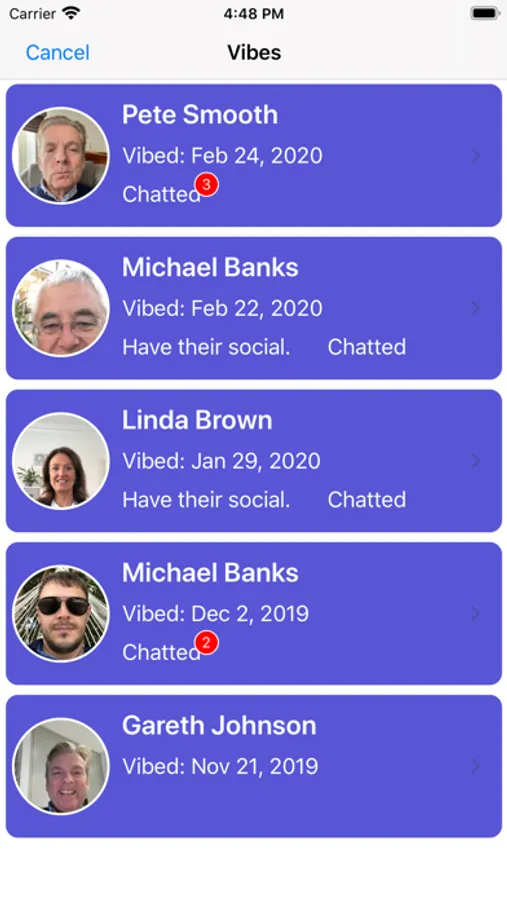 1. The Vibe App consists of BLE (Bluetooth LowEnergy) connection platform which searches for and connects to other Vibe App users where information can be exchanged.