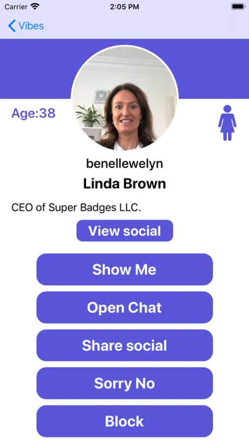 2. The Vibe App can connect via BLE to an optional wearable Vibe display pin which can show a user’s own status. The Vibe app shows a user’s profile and interaction summary in a format that they can personalise.