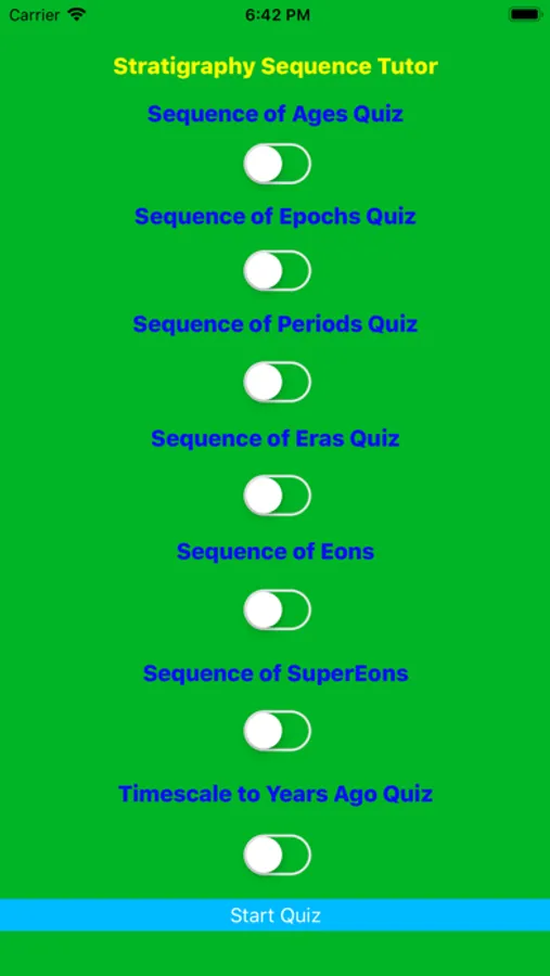 Stratigraphy Sequence Tutor is an app to help you memorize the sequence from most recent to earliest of the Ages, Epochs, Periods, Eras, Eons & SuperEons. Additionally, there is a quiz to help you memorize how many years ago in sequence for the Ages, Epochs, Periods & Eras in named order from most recent to earliest.