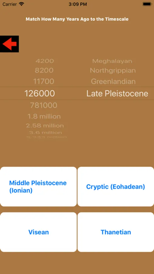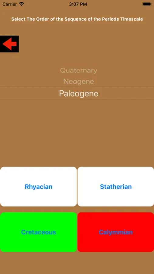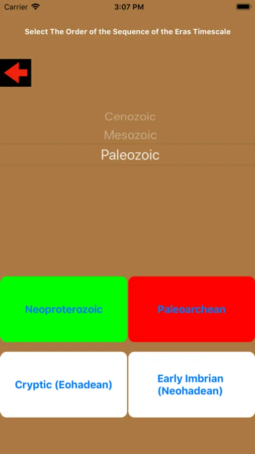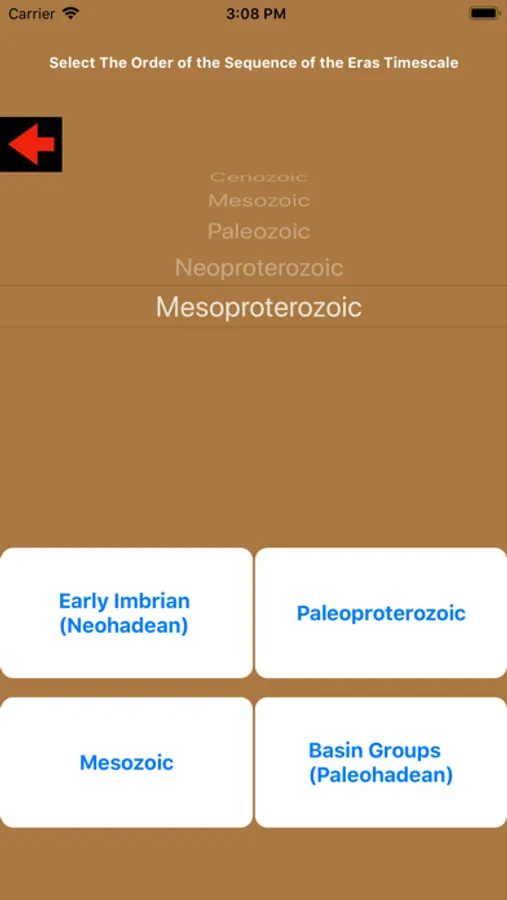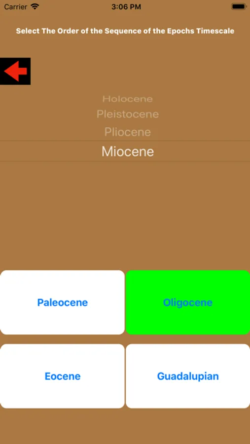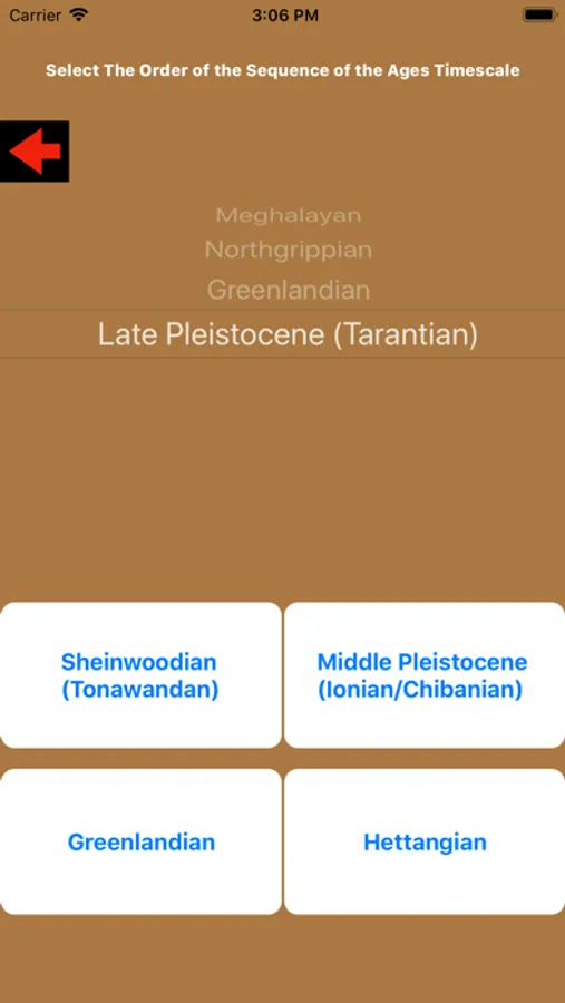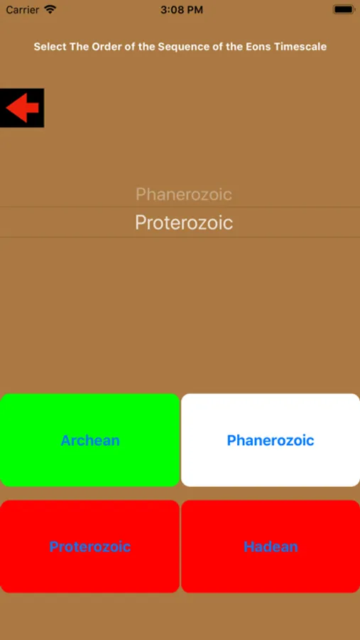 As you select each timescale your correct answer will appear in the PickerRoll. You may roll through your correct answers to help you review and memorize the correct sequence of timescales and when you are ready to select the next timescale in the sequence then the PickerRoll will roll back automatically to your most recently chosen answer in the sequence and add the next correct answer to the list.
