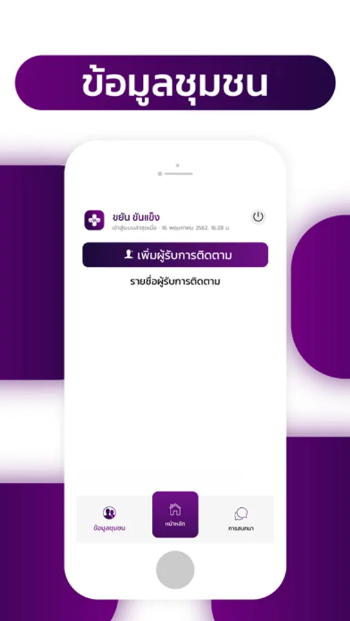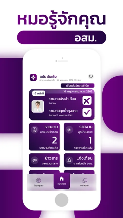 ระบบเพื่อการทำงานด้านส่งเสริมสุขภาพ ตรวจสอบข้อมูลสุขภาพของคนในชุมชน สำหรับกลุ่มผู้ใช้อาสาสมัครสาธารณสุขประจำหมู่บ้าน (อสม.) อำนวยความสะดวกแก่ อสม. ในการบันทึกข้อมูลการสำรวจลูกน้ำยุงลาย บันทึกข้อมูลรายงานประจำเดือน รับการแจ้งเตือนข่าวสารประชาสัมพันธ์จากส่วนกลาง แสดงข้อมูลคลังความรู้สำหรับ อสม. ตามโปรแกรมส่งเสริมการสร้างเด็กไทยคุณภาพ พร้อมช่องทางการสนทนาออนไลน์กับบุคลากรทางการแพทย์