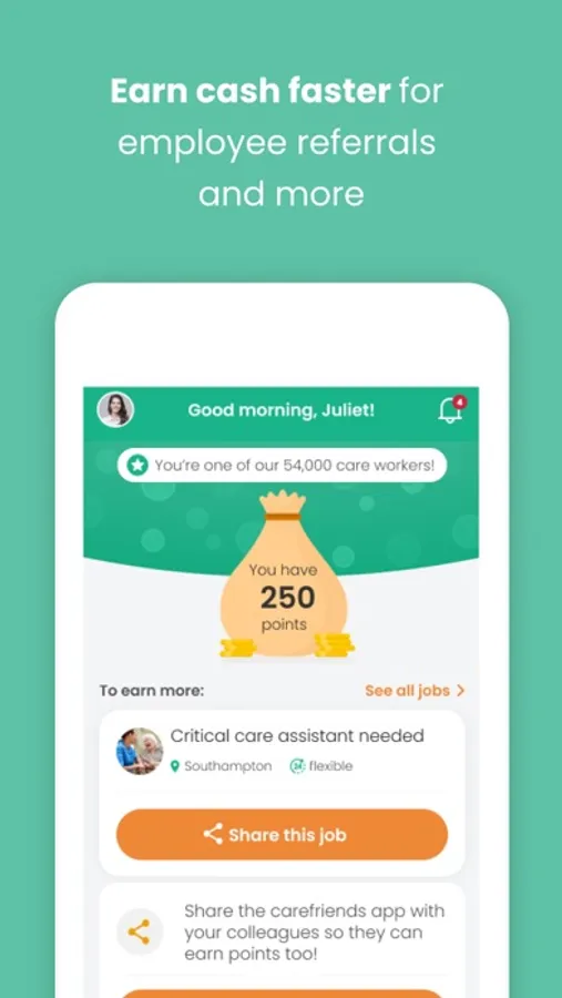 Care Friends makes it easy, fun and rewarding for you to recommend your friends, family or anyone in your social network to work at your company. You earn points which turn into cash for sharing jobs, when a candidate applies, attends interview and when they start work.