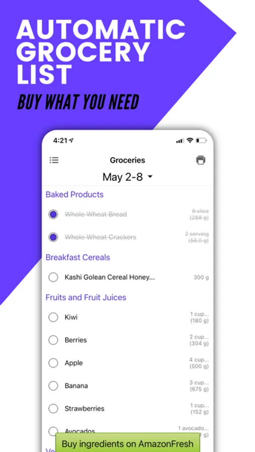 Select the date range you want to buy groceries for, and we will tell you the exact amount of each ingredient that you will need to follow your meal plan. No more throwing out food because you bought too much or forgot to eat it before its expiration date.