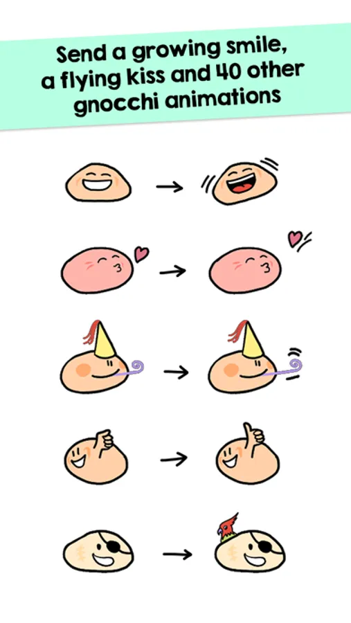 Pick the gnocchi stickers that best express your feelings and send them out as text messages or peel them and place them over bubbles, pictures or other stickers in iMessage. Also use them as camera effects both in iMessage and FaceTime.