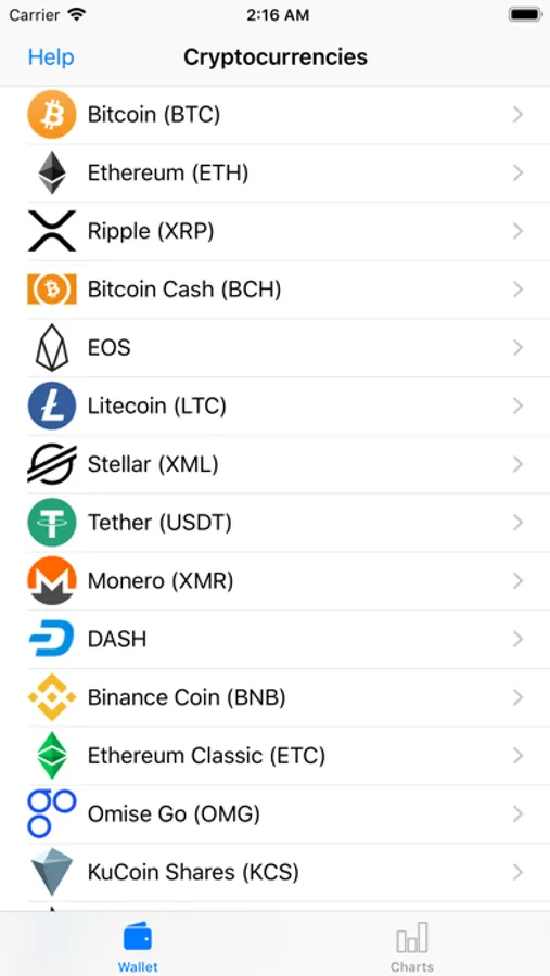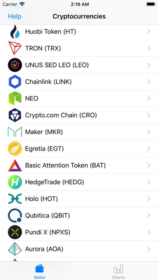 Supported cryptocurrencies: Bitcoin, Ethereum, Ripple, Bitcoin Cash, EOS, Litecoin, Stellar, Tether, Monero , DASH, Binance Coin, Ethereum Classic, Omise Go, KuCoin Shares, Huobi Token, TRON, UNUS SED LEO, Chainlink, NEO, Crypto.com Chain (CRO), Maker (MKR), Egretia (EGT), Basic Attention Token (BAT), HedgeTrade (HEDG), Holo (HOT), Qubitica (QBIT), Pundi X (NPXS), Aurora (AOA), Augur (REP)