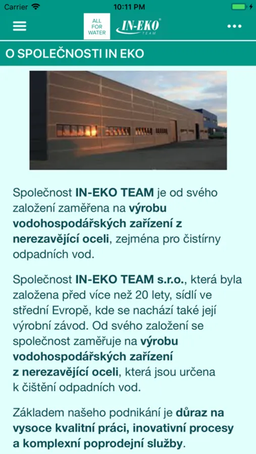 Společnost IN-EKO TEAM s.r.o., která byla založena před více než 20 lety, sídlí ve střední Evropě, kde se nachází také její výrobní závod. Od svého založení se společnost zaměřuje na výrobu vodohospodářských zařízení z nerezavějící oceli, která jsou určena k čištění odpadních vod. Základem našeho podnikání je důraz na vysoce kvalitní práci, inovativní procesy a komplexní poprodejní služby.