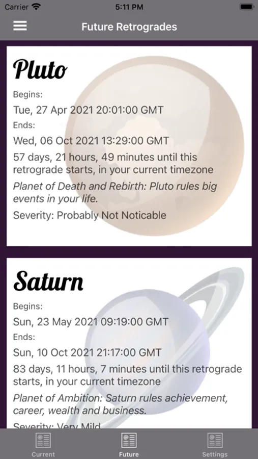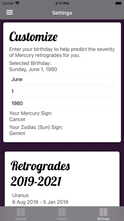 If you enter your birthday, the app will cater the display to note of the Mercury retrograde events that have the potential to affect you the most.