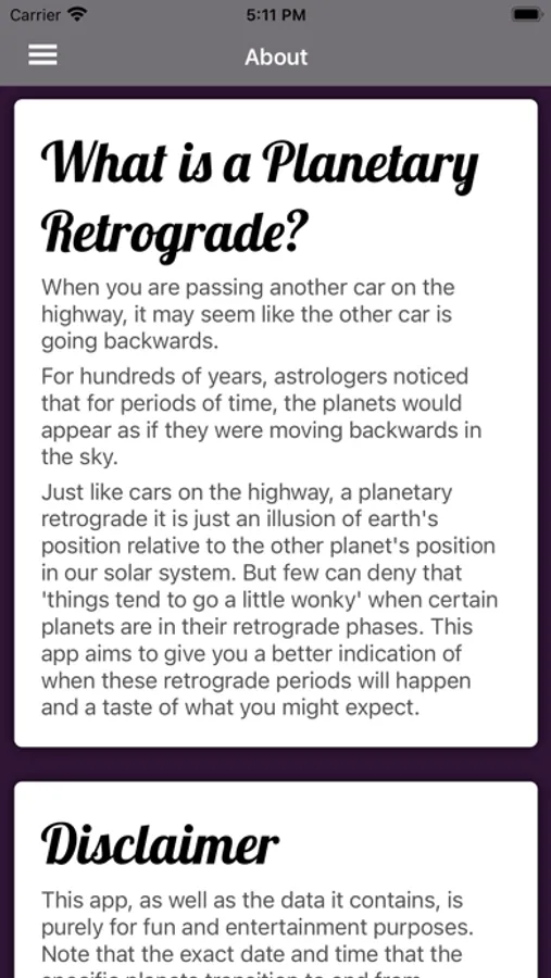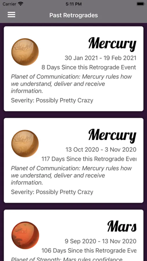 When you are passing another car on the highway, it may seem like the other car is going backwards. For hundreds of years, astrologers noticed that for periods of time, the planets would appear as if they were moving backwards in the sky. Just like cars on the highway, a planetary retrograde it is just an illusion of earth's position relative to the other planet's position in our solar system. But few can deny that 'things tend to go a little wonky' when certain planets are in their retrograde phases. This app aims to give you a better indication of when these retrograde periods will happen and a taste of what to expect.