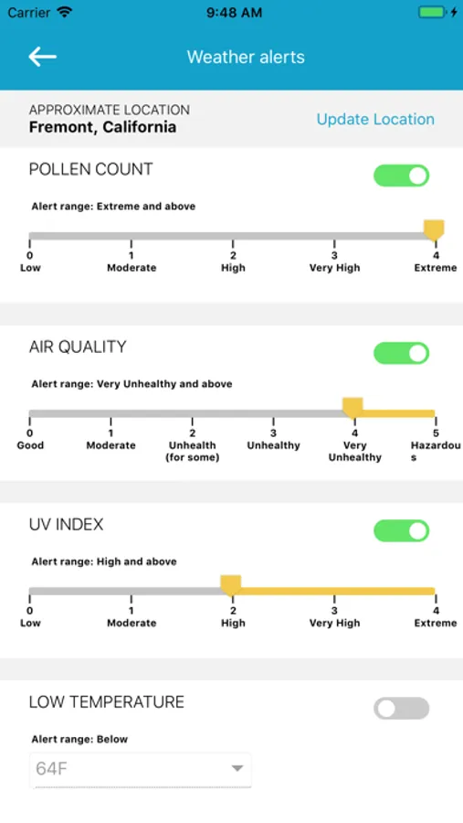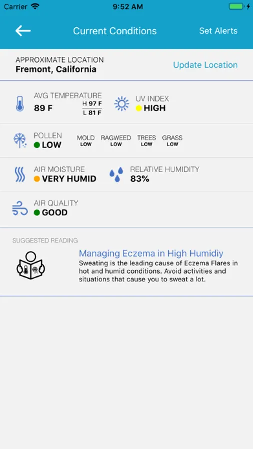 • Environmental Triggers like Pollen count, UV Index, Humidity, Air Quality and Temperature are automatically logged when a user Tracks their Eczema severity using "Log Now" option.