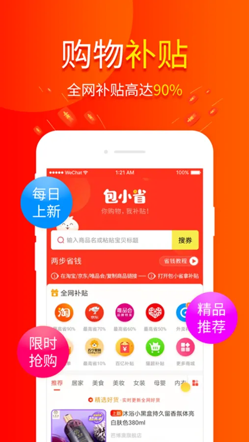 包小省APP-网购导购返利隐藏优惠券搜索工具,领券后下单在返回优惠,省钱可达90%