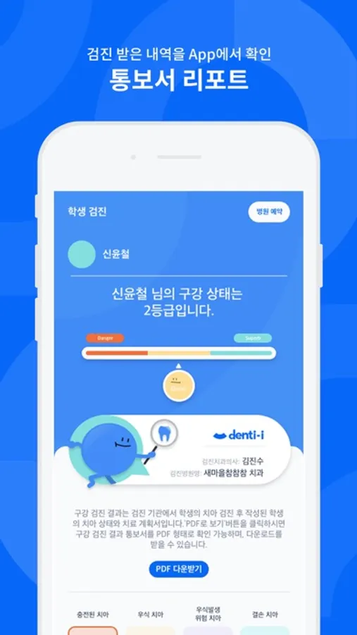 경기 치과주치의 참여 치과병원 시스템과 실시간 연동되어 우리아이의 구강검진결과를 맞춤형 예방리포트로 쉽고 빠르게 확인할 수 있습니다.