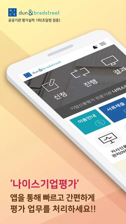 국내최초로 공공기관입찰용 평가 업무를 시작한 ㈜나이스디앤비는 공공기관 입찰용 평가실적 1위(조달청 검증)의 전문기관으로서 그 공신력을 인정받고 있으며 건설, 전기, 전자, 자동차, 조선, SI, 식품, 유통 등 국내 전 산업부문 300여 개의 대기업과도 업무협약을 체결하여 협력업체와 원청/대기업 간 거래의 기준점을 제시하고 있습니다.