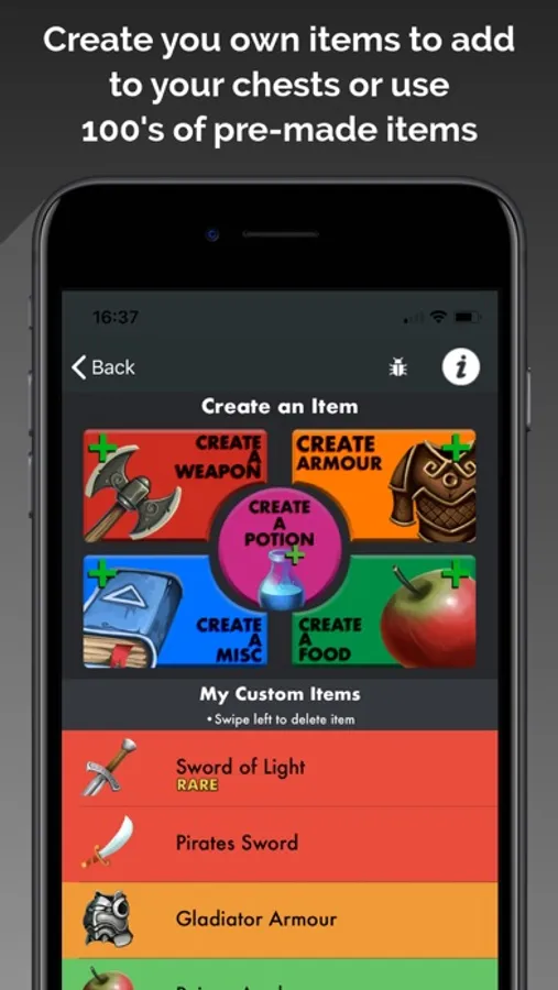 *Item creation: Users can create their own items to add to their chests. Weapons, Armour, Food, Potions and Misc items can all be created. Items value, weight, name, appearance and rarity can be customised.