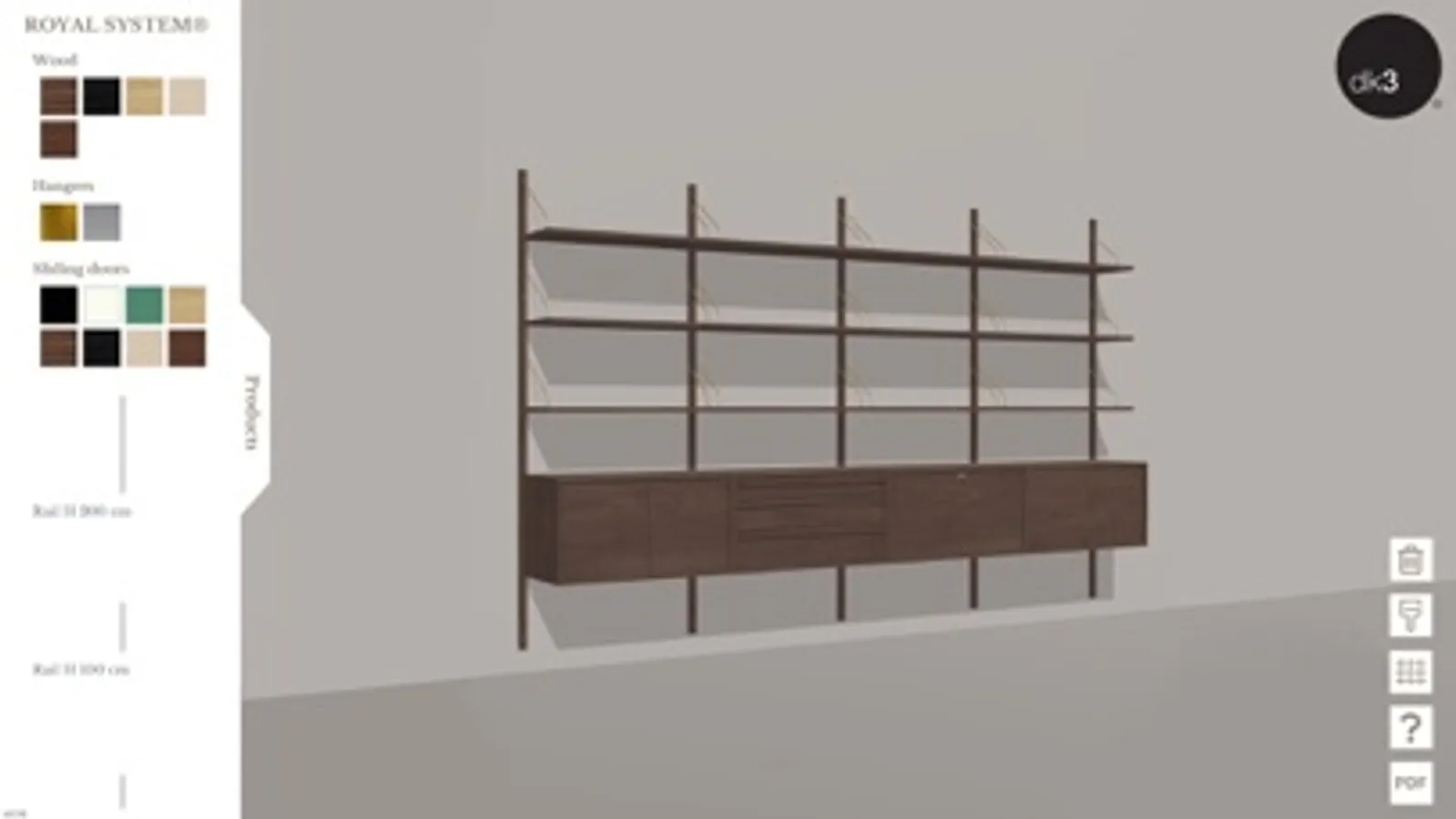 With the dk3 configurator you can create your own combinations of the shelving systems ROYAL SYSTEM®, SYSTEM ULTRA® and SYSTEM CADO®, designed by the famous Danish furniture designer Poul Cadovius back in 1948, 1957 and 1960, and relaunched by dk3 in the period between 2010 and 2019.