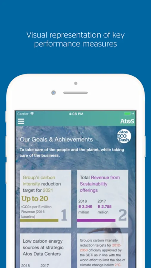The value add of Atos Green is access to key indicators, documentation, reports, news and contacts in a unified view, accessible anywhere and anytime. The visual representations of sustainability related information, enable users to understand sustainability through a new perspective.