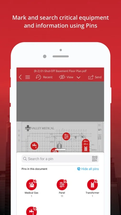Quickly locate As-Builts or shutoffs with just a few taps. Visualize the relationship of As-Builts over time with our proprietary As-Builts Map View screen. A layered floorplan view makes it easy to determine which renovations or projects affected each room or space in the building. Simply tap a color-coordinated area to bring up the corresponding As-Built in seconds. Easily locate shutoffs for any building or floor with clickable maps.
