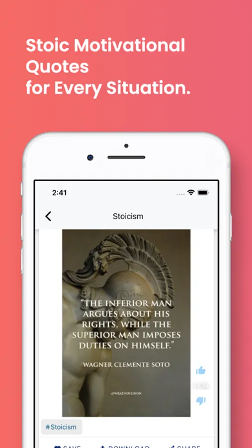 Stoic Motivational Quotes & Greek Philosophy with daily quote notifications. 1M+ Quote pictures and texts. You can favourite quotes, copy and share with your friends. Breathing exercises to improve your focus and mood. This app lets you browse famous stoic quotation, mark them as favourite, and share with your friends or near and dear ones. All the wisdom gathered in one place. We wish to give all the people in the world the most inspiring and motivating quotes to help them the throughout all their challenges! We have gathered some of the most amazing motivational quotes and wisdom from Greek Stoic Philosophy in this one App. You can access these quotes anytime, anywhere. Save your favourites, share them with your friends, or use them as your own personal motivation! These words of wisdom will help you through every challenge you face, so that you can achieve anything you set your mind to! So download now and get inspired!