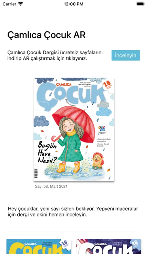 Etkileşimli içeriklere ulaşmak için “Çamlıca Çocuk AR” logosu gördüğünüz sayfalara uygulamayı açarak ekranın görüntü alanına getirin. Sizin için hazırladığımız özel içerikleri keşfederken yeni şeyleri etkileşimli olarak öğrenmenin keyfine varın.
