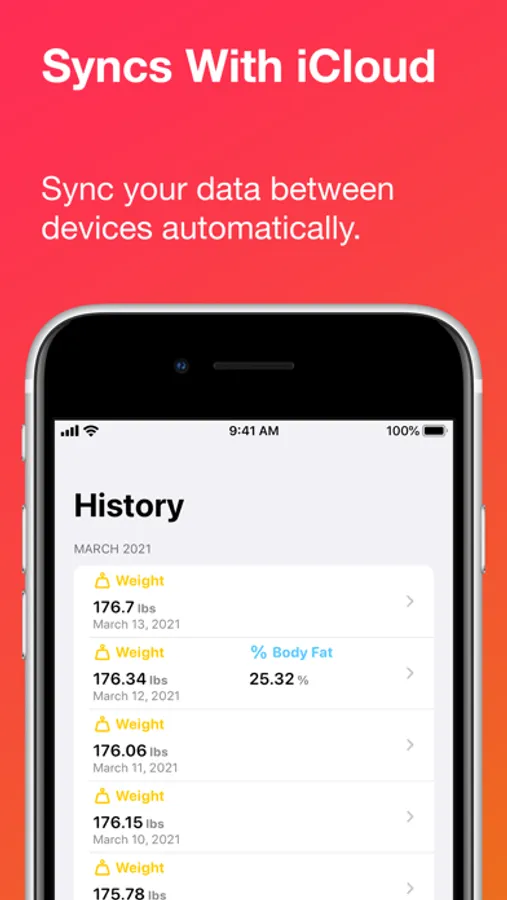 Weighed synchronises your data between devices automatically using iCloud. Record your entries on your iPhone, and review your progress on your iPad.
