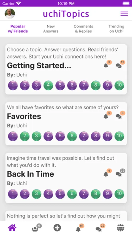 Submit UchiTopics and create your own sets of 10 questions. Give it a title and your name because you deserve the credit. Your uchiTopic will be publicly available but your answers are still only accessible by your Uchi. We’ll be ranking uchiTopic popularity so make it good and you’ll win a prize! (Note: uchiTopics will soon be an in-app purchase.)
