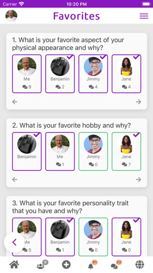 DISCOVER - You may pick a question and think, “I wonder how mom would answer this one?’” or “What did my best friend Sally say?”. Well, if in your Uchi, you’ll have access to Sally’s response, but only AFTER you answer that same question. The rule is your friends’ responses “unlock” only after you share too. Uchi is a “two-way street”.