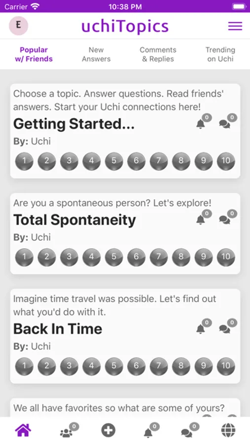 ANSWER - Uchi’s Q&A platform prompts you with fun, inquisitive and thought-provoking questions so you can share your perspectives about the world. UchiTopics (all free) are composed of 10 questions which you can pick from and answer, or not, in any order you want.
