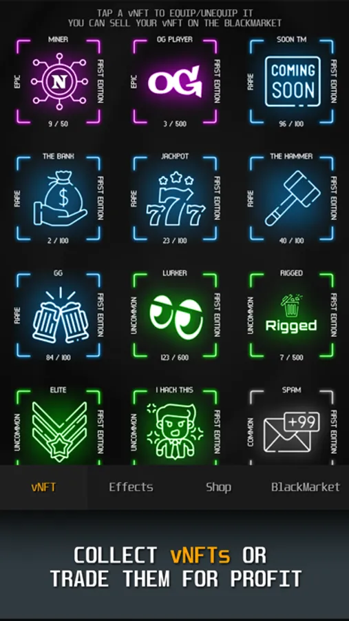VNFTs are like real NFTs but they are virtual. However, they are extremely valuable inside the game, and you will be regarded as a king in the community if you have a huge amount! You can trade them in the in-game black market!