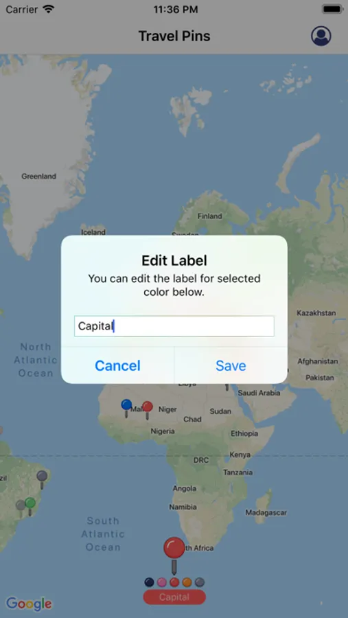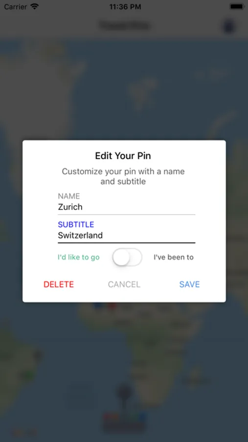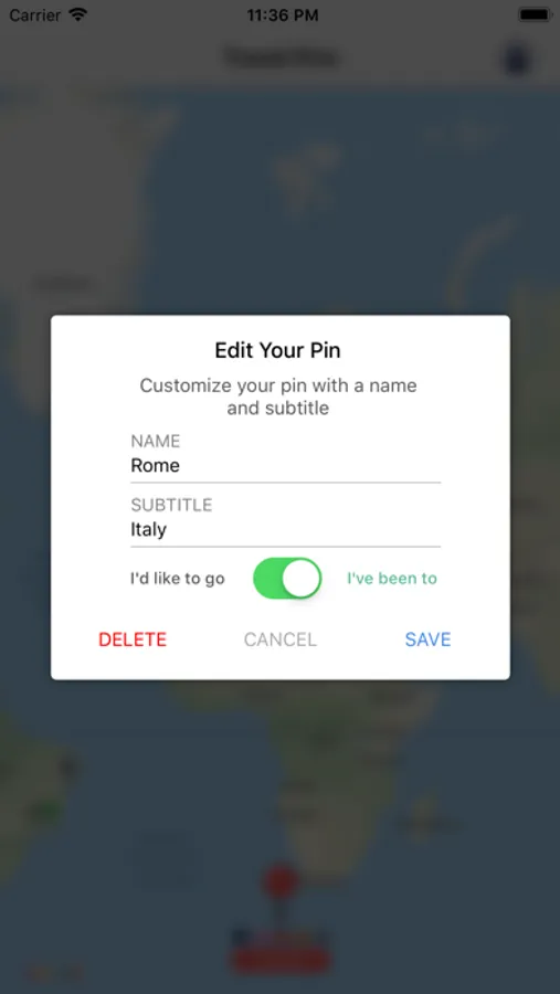 With Travel Pins, you can give your pins any name and subtitle. You can mark a pin as a wishlist pin and choose among various pin colors.