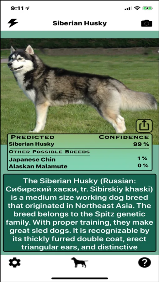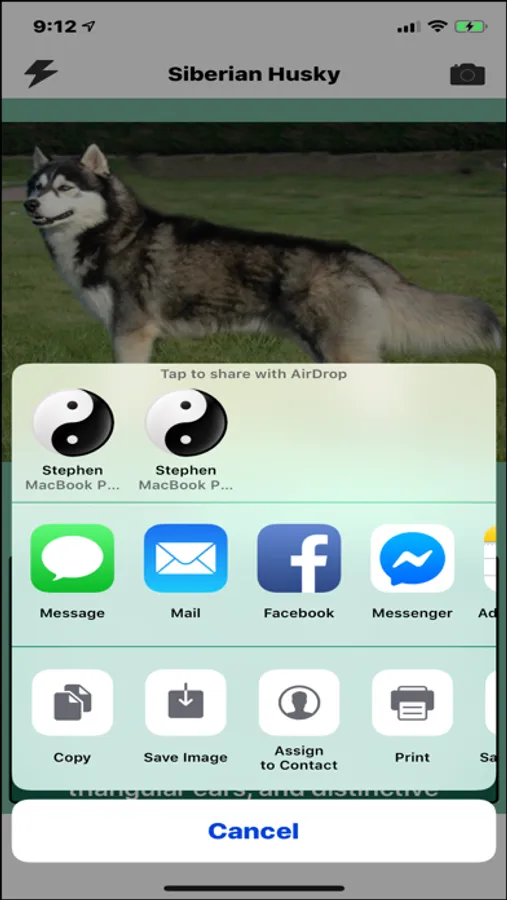 • Share the selected dog with its prediction and description to any of the social media venues (FB, Twitter, Save to Photo's, and more) via the "Share" button.
