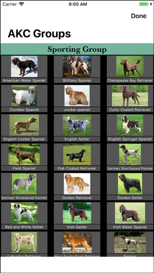 • Click on the "Breeds" button to see a complete list of all the AKC Groups and the over 170 breeds they contain...each breed has the AKC group that it's in, the image of what it looks like, and its description information.