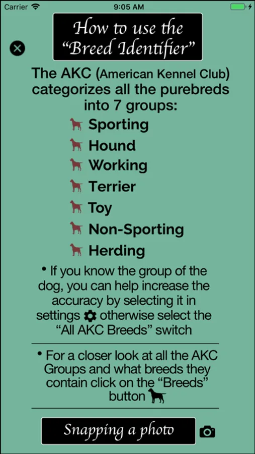• If you know the AKC group of the dog, you can select it in the settings tab to fine tune the predictions, or simply choose the "All AKC Breeds" option. The AKC categorizes all breeds into seven groups: (1) Sporting (2) Hound (3) Working (4) Terrier (5) Toy (6) Non-Sporting (7) Herding.