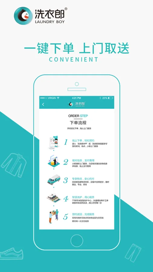 【便捷】洗衣郎洗衣,1键下单,轻松快捷;2小时内上门取送衣、鞋,服务到家;3天送回,洗衣过程可追溯。