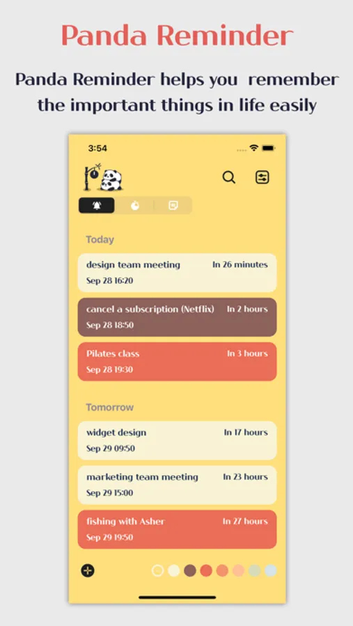 Use the bottom left + icon to register your schedule on Panda Reminder. Panda Reminder notifies you of everything entered at the scheduled time
