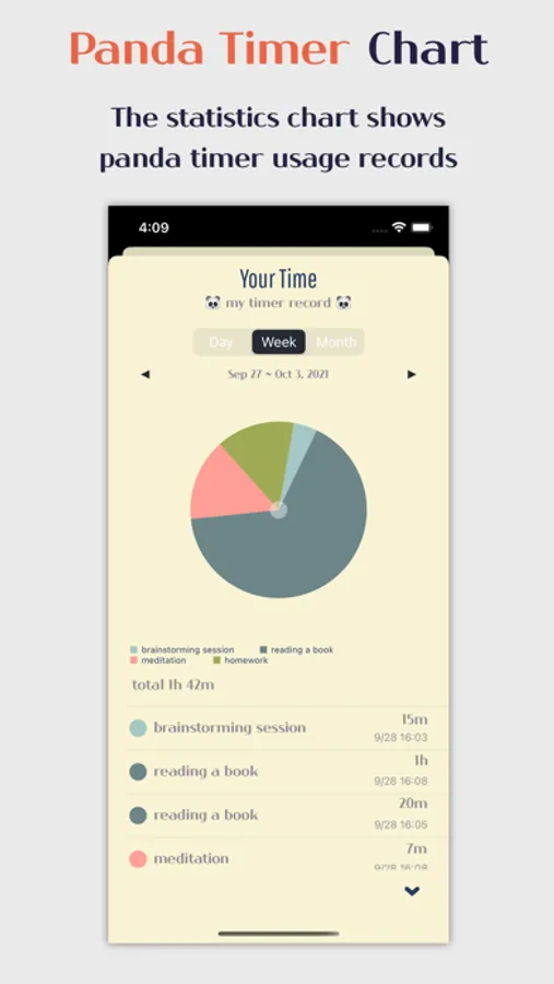 Panda Timer Statistics shows the usage history of Panda Timer for one day, one week, and one month. You can check your time usage pattern, and delete anything entered incorrectly.