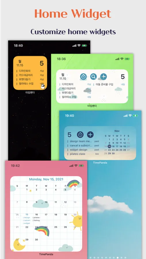 We provide twenty widget background designs for beautiful home screen widgets. You can decorate the home screen widget by using various font shapes and font colors, and you can also select a picture saved in your phone as a background image. (Settings > Widget Design)