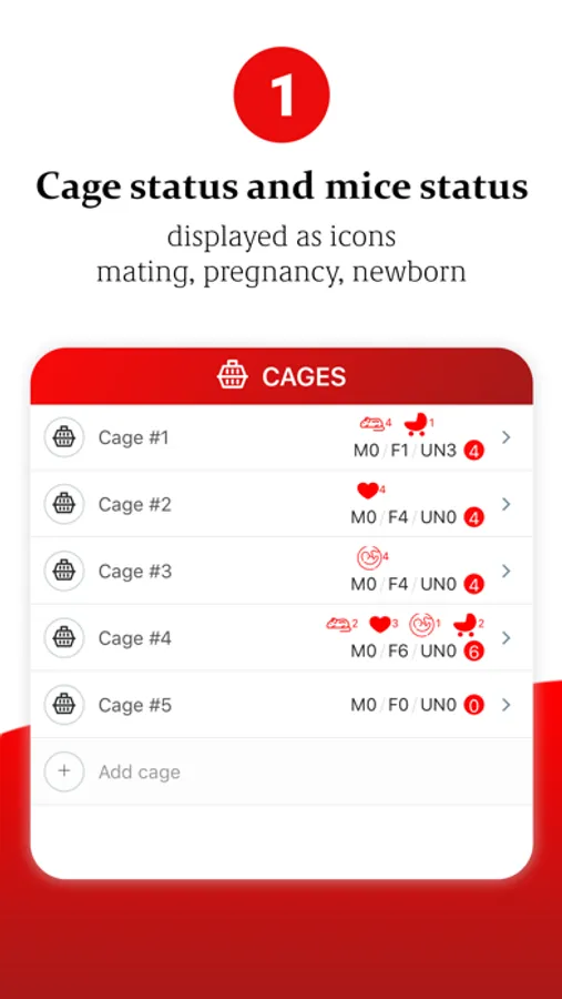 Cage status and mice status are displayed as icons (mating, pregnancy, newborn)