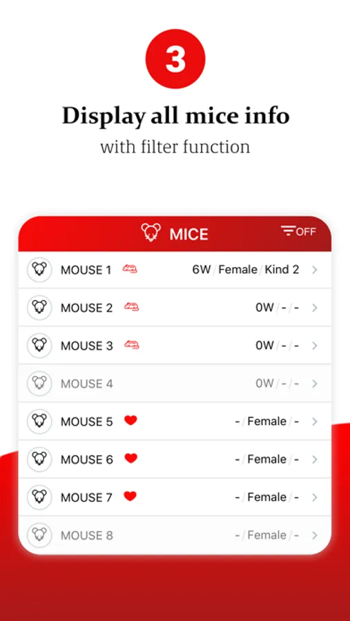 Lifecycle data of mice like birth, age, parents, mating, pregnancy, demise, etc, can be easily monitored.