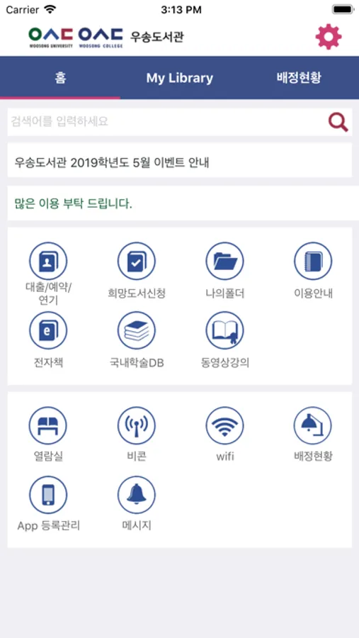 우송도서관은 모바일 앱(APP)을 개발함으로써 iOS를 통한 서비스를 제공하게 되었습니다. 앱(App)을 통해 도서관소개, 이용안내, 통합검색, 대출조회 및 연기신청, 예약 등 도서관에서 제공되는 모든 서비스를 동일하게 이용할 수 있습니다.