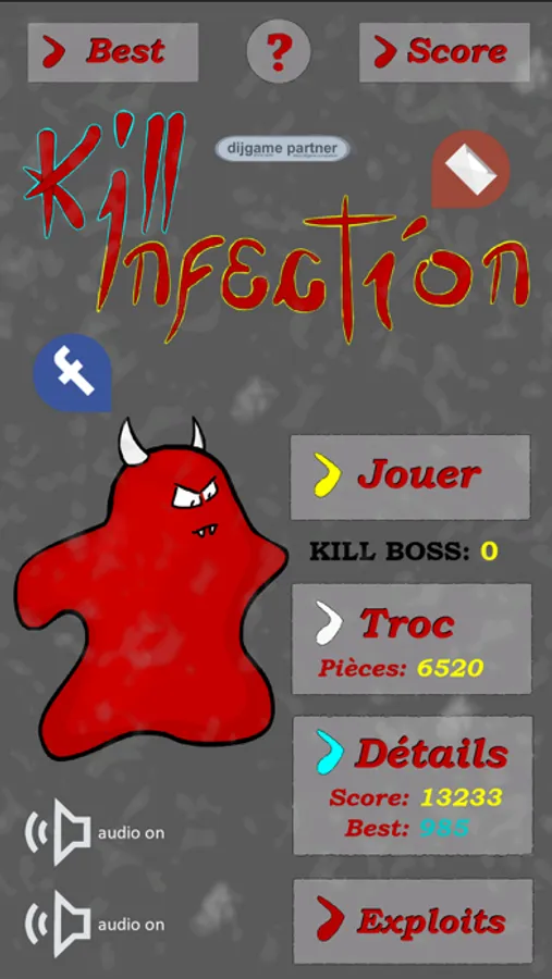 A little arcade game, whose goal is to crush infections to collect a maximum of points (coins) which will allow you to unlock objects (bonus) and equipment necessary to evolve and appear a boss level.