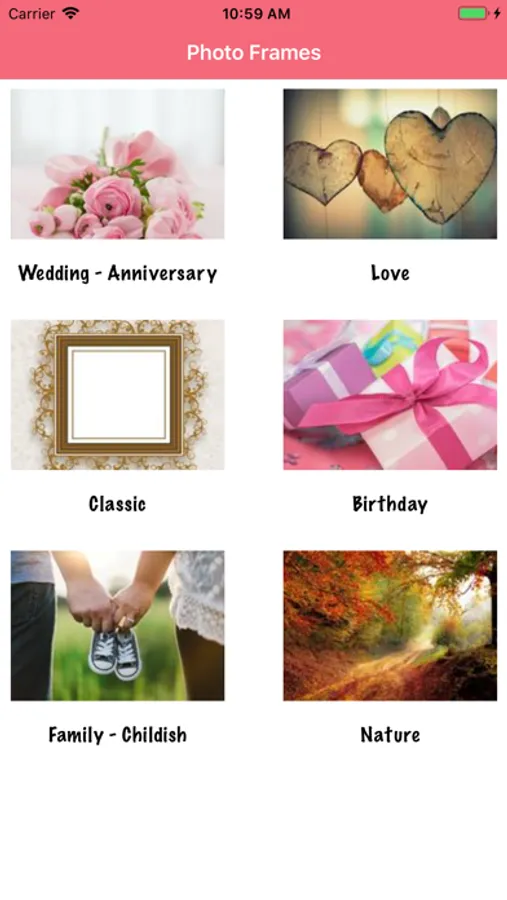 - A huge quantity of frames for your photos: choose between multiple designs, organized by category: birthday photo frames, love frames, children, baby and family, wedding or anniversary, nature, etc.
