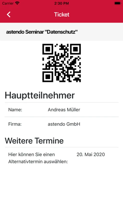 - Ticket mit Buchungsnummer, Name und QR-Code für die Teilnehmer
