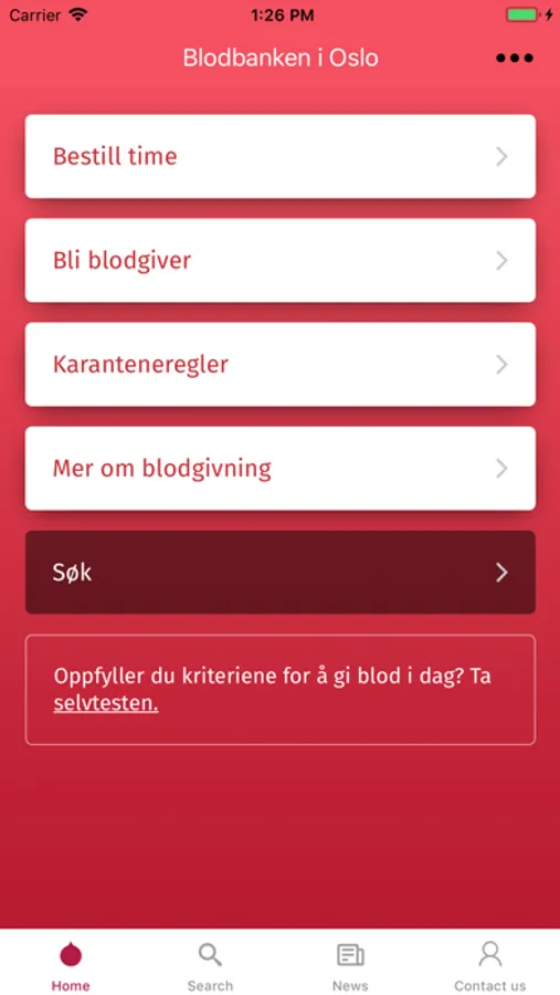 Videre vil du kunne lese nyheter fra blodbanken (f.eks. endringer i reisekarantener eller åpningstider) og om ønskelig motta push-varsler ved eventuelle situasjoner med blodmangel. Tar du appens selvtest for etablerte givere, vil du få svar på om du oppfyller kriteriene for å gi blod i dag. Du finner også informasjon om timebestilling via internett, telefon eller e-post.
