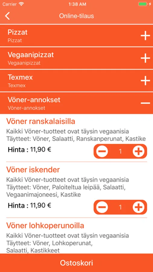 Tilaa pizzat ja kebabit noutona tai kotiinkuljetettuna. Tarjontaamme kuuluvat Pizzat, Vegaanipizzat, Texmex, Vöner-annokset, Leikkeet, Kanaleikkeet, Hampurilaiset, Special burgerit, Pihvit, Kalaruoka, Kebabit, Rullat, Kanakebabit, Falafelit, Calzonet ja Salaatit.